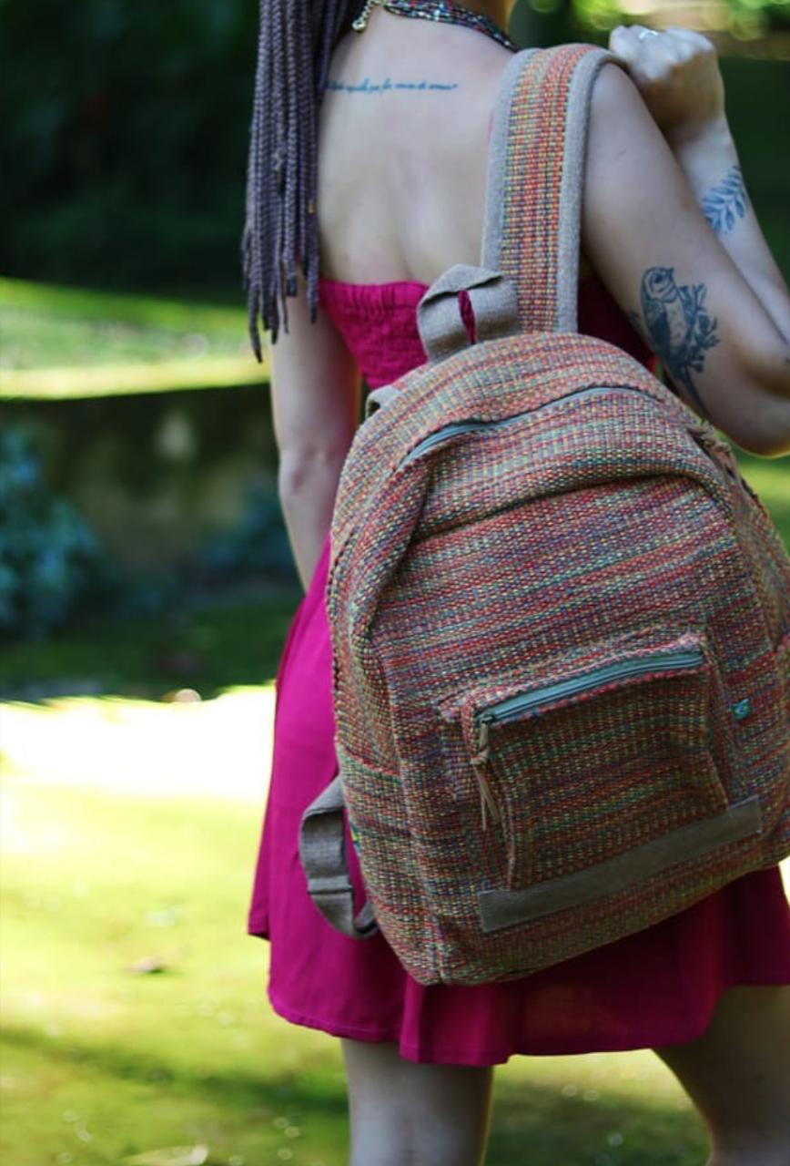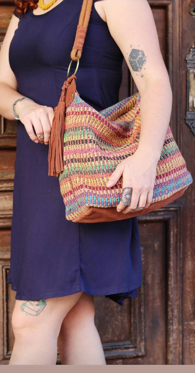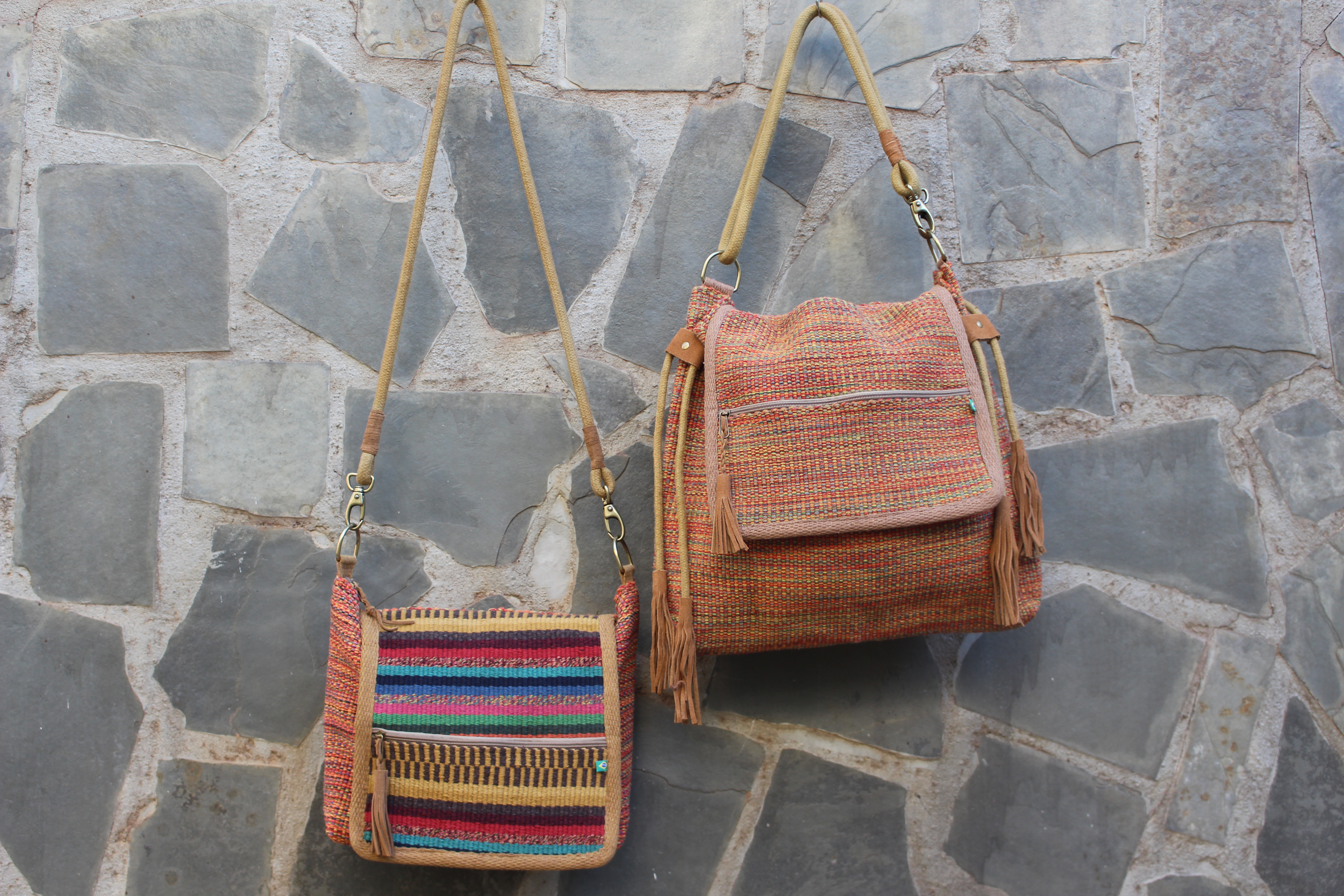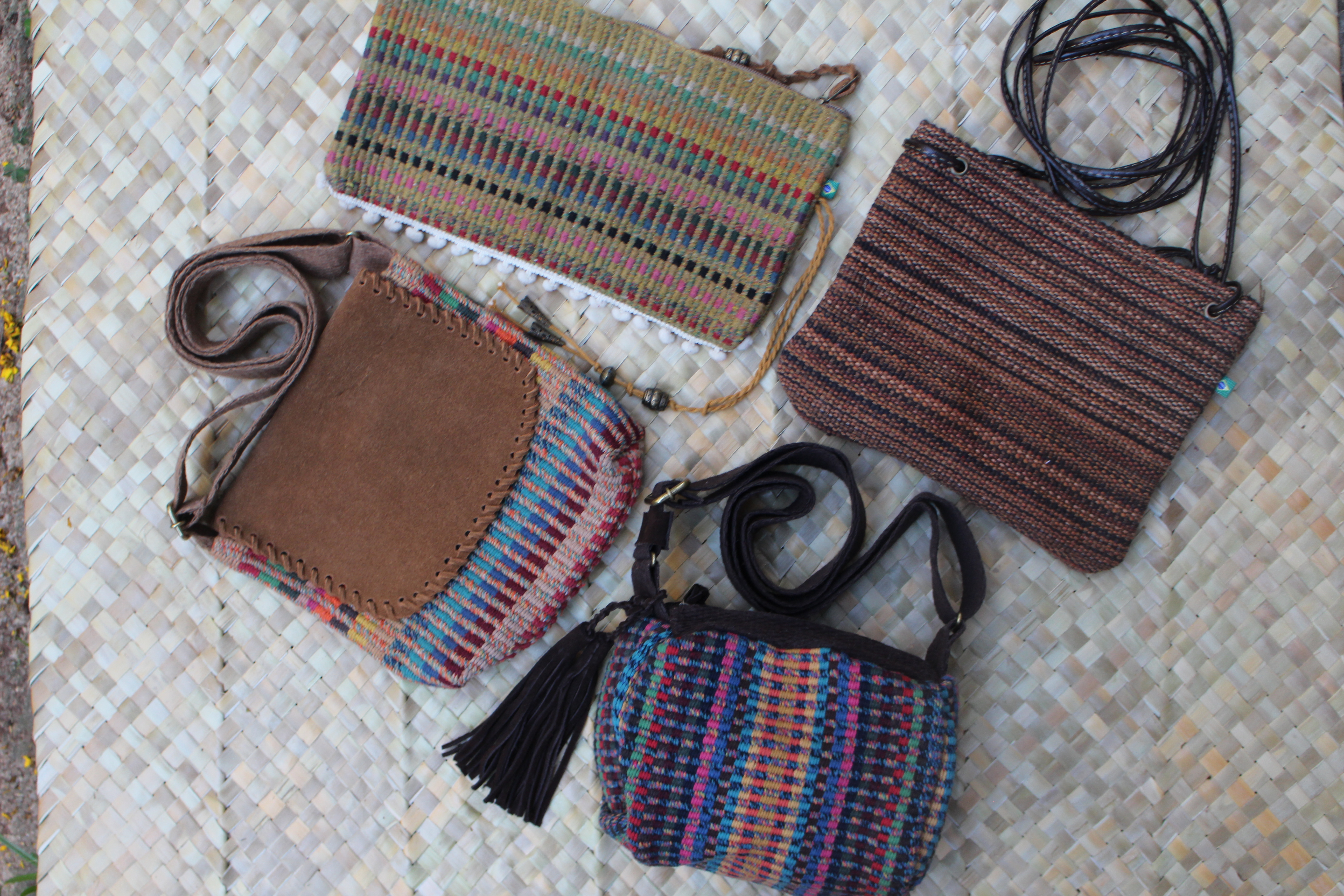 Peças utilitárias confeccionadas em tear chileno e mineiro, com acabamento em couro e metais, e um tingimento exclusivo que torna as peças únicas em estilo próprio, produzidas manualmente.